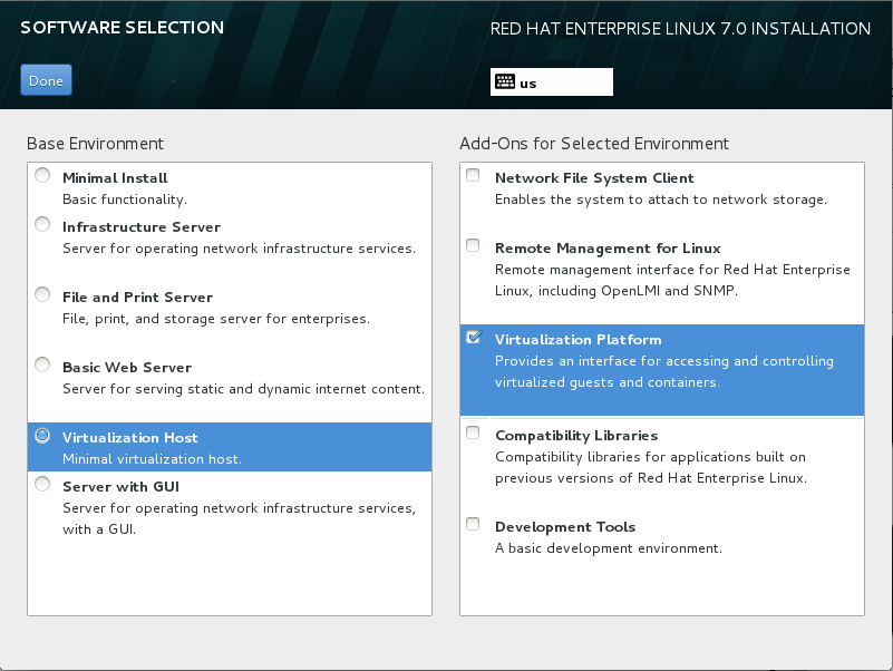 To build a virtualization host during a graphical install of Red Hat Enterprise Linux, choose the base environment Virtualization Host in the left pane of the anaconda Software Selection screen. Select the Virtualization Platform Add-On checkbox in the right pane to include the management tools and utilities, as shown in the following figure.
