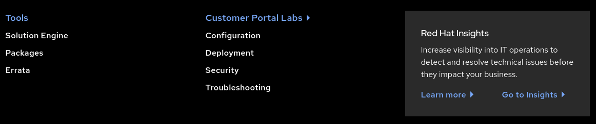 The menu provides links to tools to help you succeed with Red Hat products. The Solution Engine section provides you with an efficient way to search for solutions to your problems quickly, by product, and opening a support ticket if you do not find a satisfactory solution. The Customer Portal Labs section provides a collection of web-based applications and tools to help you improve performance, diagnose issues, identify security problems, and optimize your configurations. For example, the Product Life Cycle Checker allows you to select a particular product and view its support life cycle schedule. Another tool, the Rescue Mode Assistant, helps you reset the root password of a system, generate diagnostic reports, or fix boot-time problems with file systems. But there are many other tools available at that site.