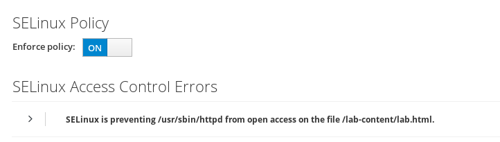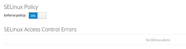If Web Console is installed it can also be used for troubleshooting SELinux issues. Log on to Web Console and select from the menu on the left. The SELinux Policy window informs you of the current enforcing state. Any issues are detailed in the SELinux Access Control Errors section.