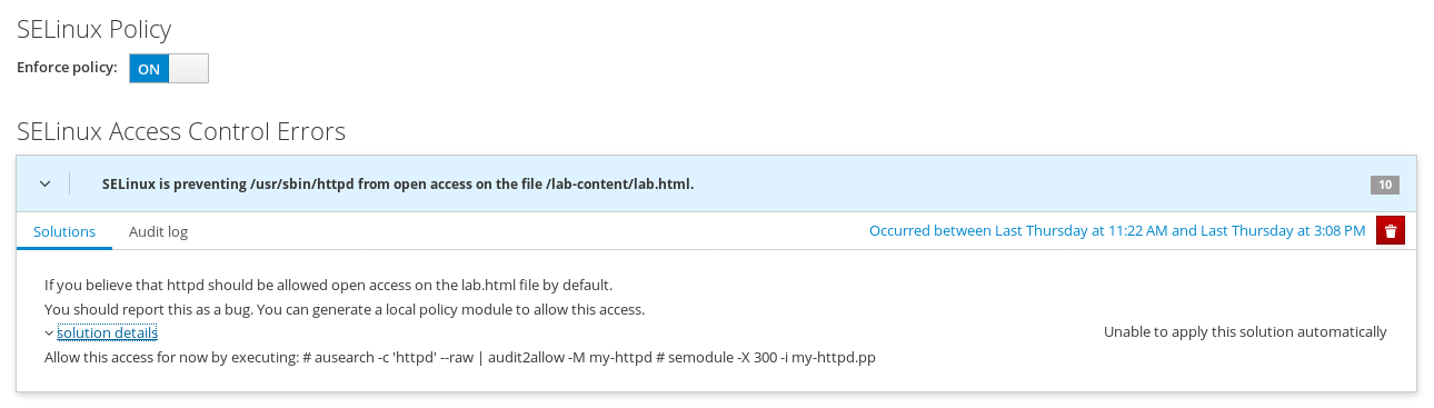 Once the problem has been solved, the SELinux Access Control Errors section should no longer show the error.