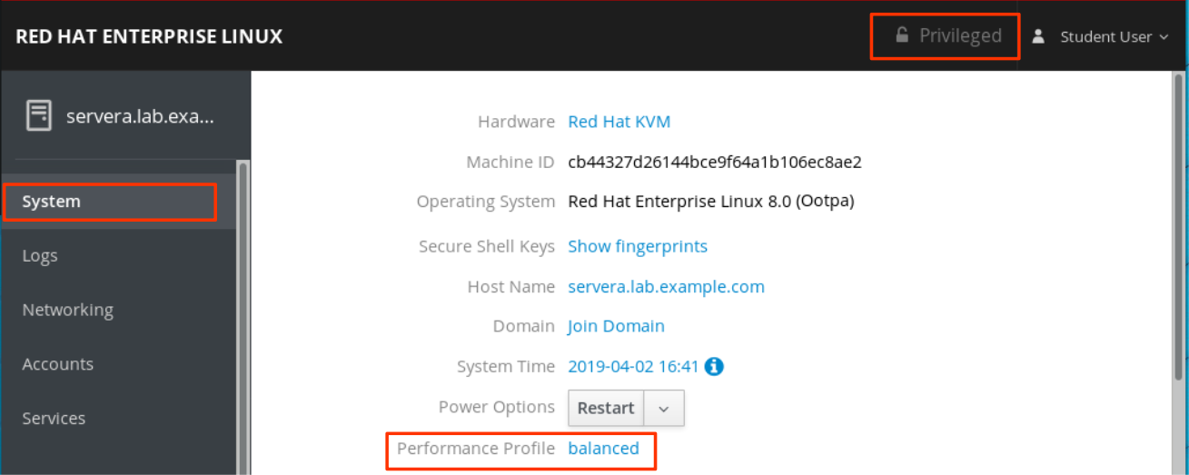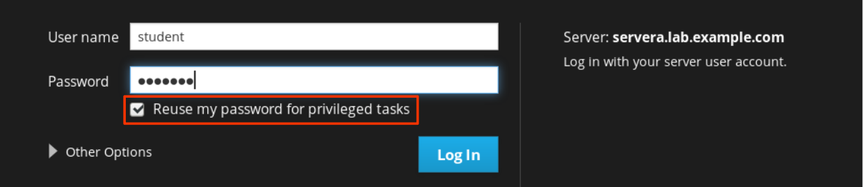 To manage system performance profiles with Web Console, log in with privileged access. Click the Reuse my password for privileged tasks option. This permits the user to execute commands, with sudo privileges, that modify system performance profiles.