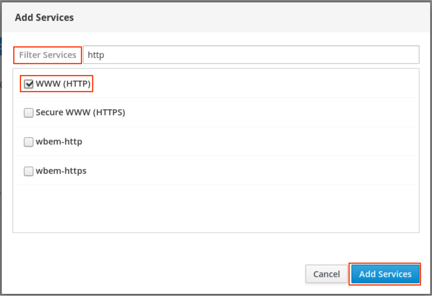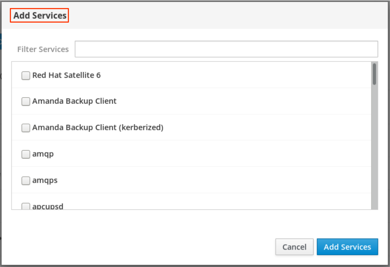 To select a service, scroll through the list or enter a selection in the Filter Services text box.
