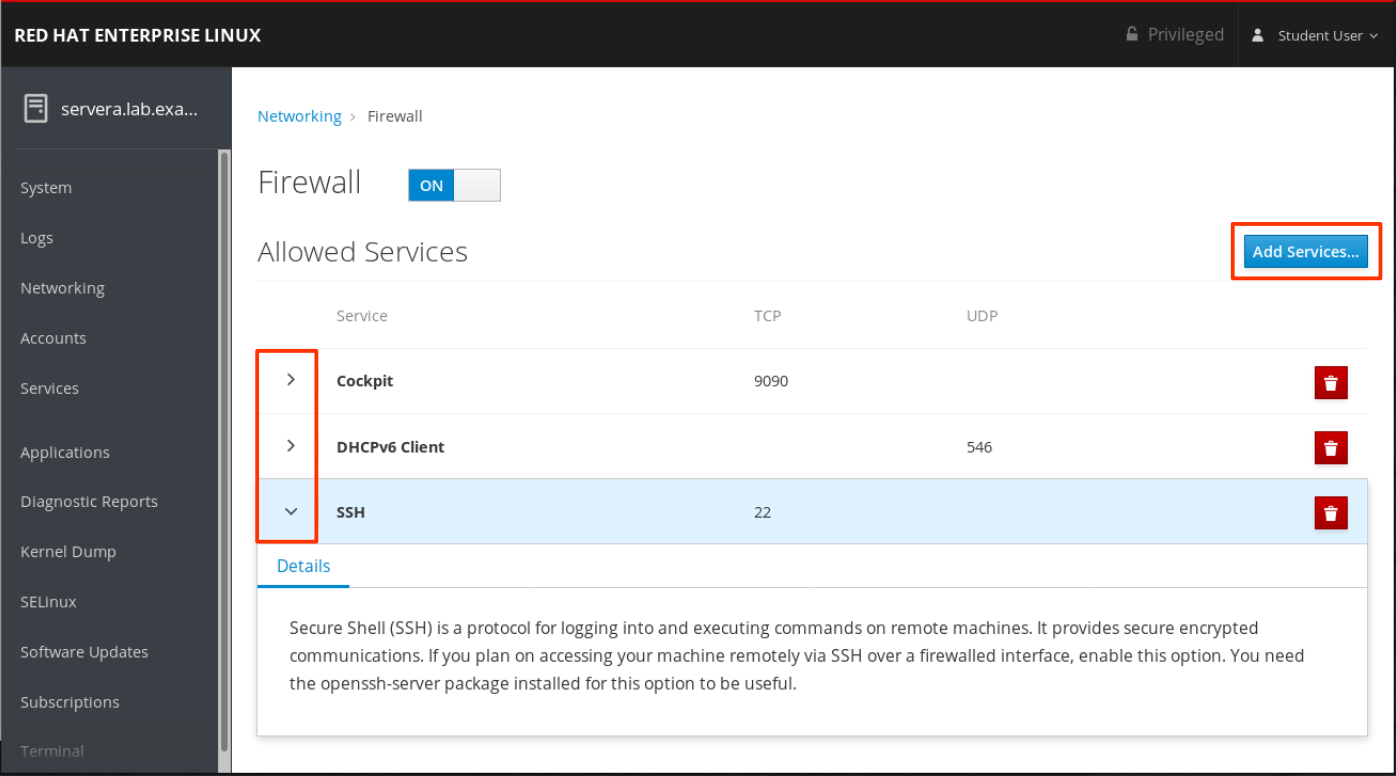 Click the option in the left navigation menu to display the Firewall section in the main networking page. Click the Firewall link to access the allowed services list.