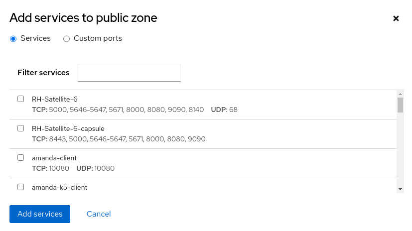 ...output omitted...If the predefined service configurations are not appropriate for your scenario, then you can manually specify the required ports and protocols. You can use the web console graphical interface to review predefined services and manually define more ports and protocols.