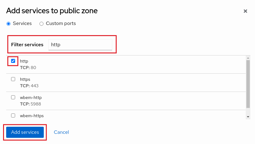 To select a service, scroll through the list or enter a selection in the text box. In the following example, the http string filters the options to web-related services. Select the checkbox to the left of the service to allow it through the firewall. Click the button to complete the process.