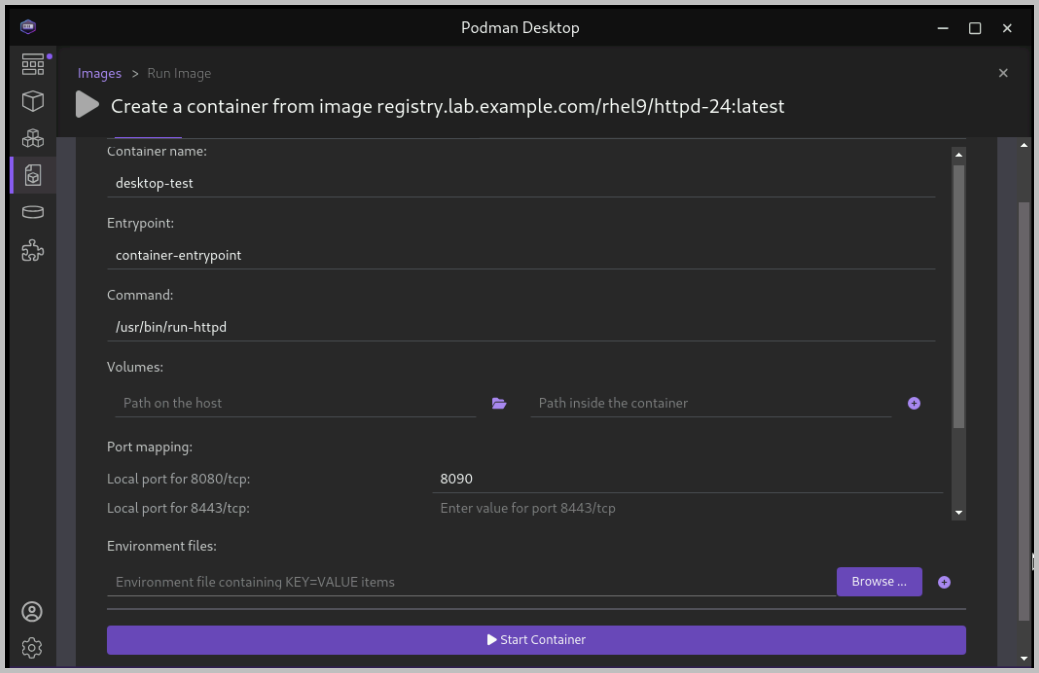 rhel9/httpd-24image to run a new container based on this image.In the container creation form, enter the following values:
