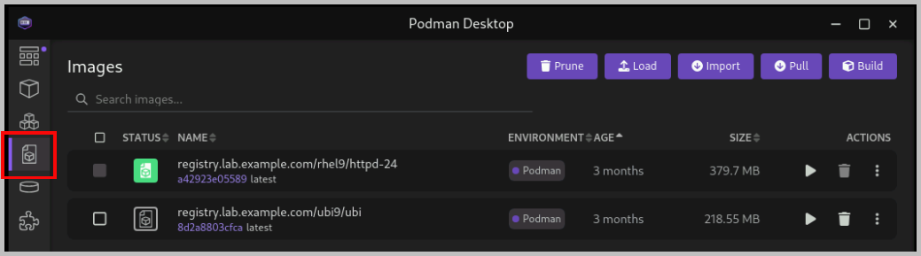 podman imagesREPOSITORY TAG IMAGE ID CREATED SIZE registry.lab.example.com/ubi9/ubi latest 8d2a8803cfca 3 months ago 219 MBIn a command line terminal, use