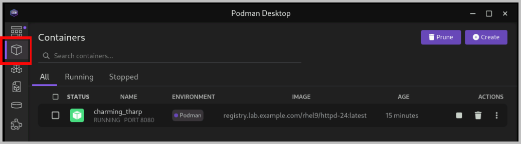 Click in the Podman Desktop navigation panel. The list includes the containers that you created in the exercise. Verify that the Apache HTTP container is running.