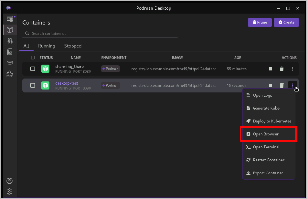 http://localhost:8090.Return to Podman Desktop. In the