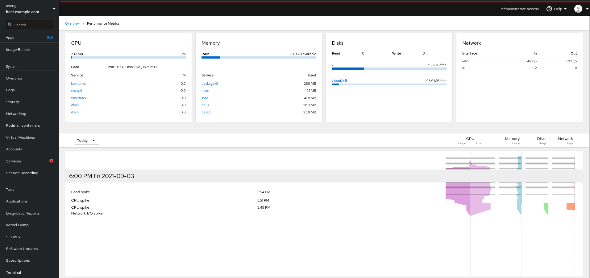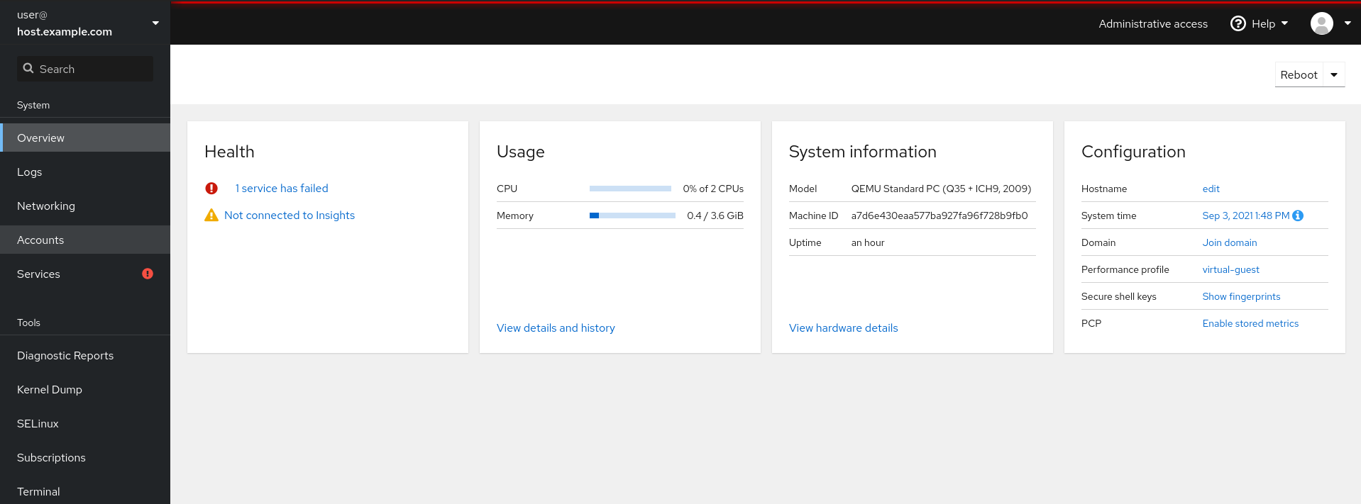 [root@host ~]# systemctl enable --now cockpit.socketThe web console uses existing system user names and passwords. If you are logging in with a user account with sudo privileges, you can perform privileged tasks in the web console, such as installing software or configuring SELinux.