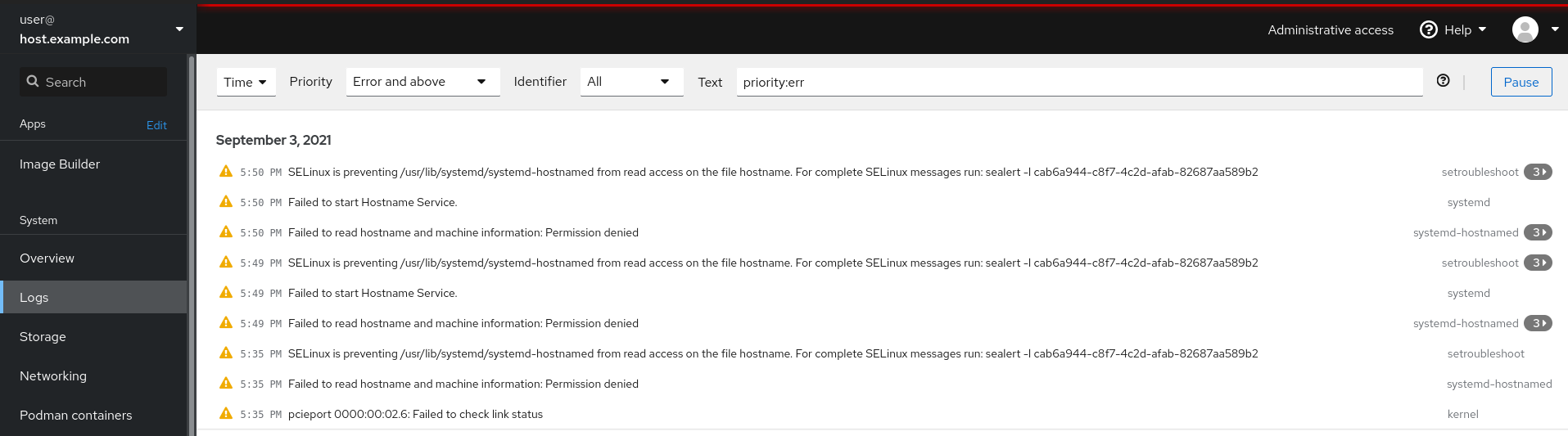 The web console Logs page provides an interface for displaying journalctl log journals. Log entries can be filtered by Time, Priority, Identifier, and Text patterns.