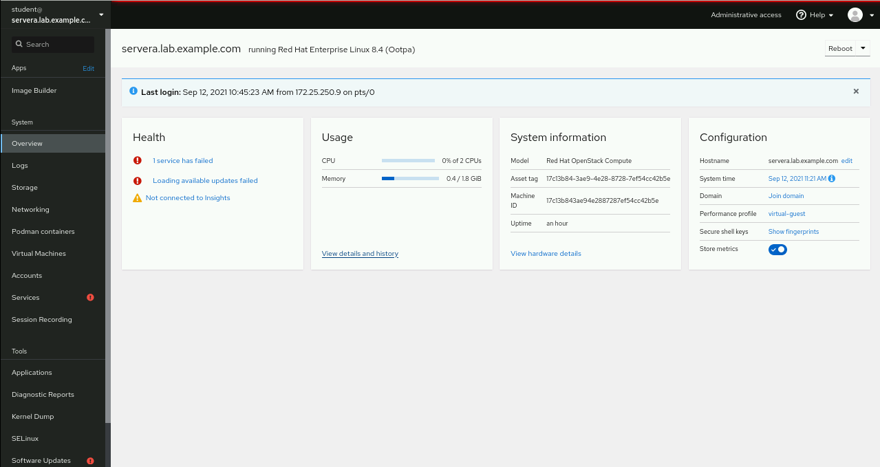 workstation, open a web browser and navigate to https://servera:9090. Accept the certificate warning. Log in with user namestudentand passwordstudent.Review the alerts that are reported in the overview.