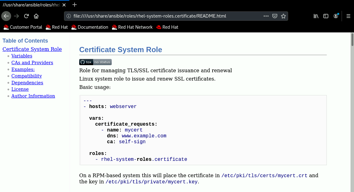 [user@host ~]#cd /usr/share/ansible/roles[user@host roles]#firefox linux-system-roles.certificate/README.html