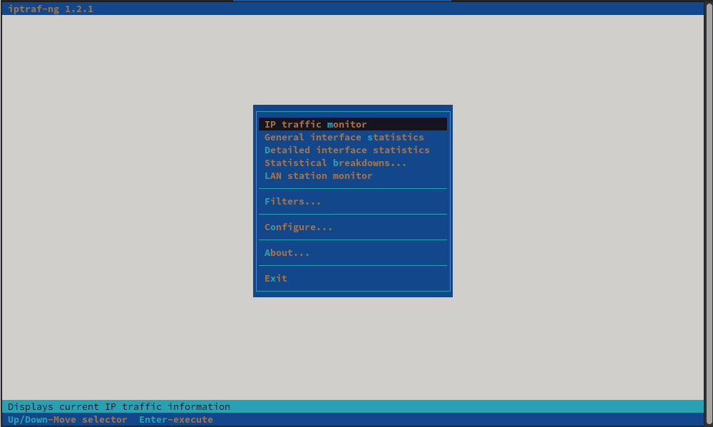 The iptraf-ng command requires superuser privileges. The following screen capture shows the main menu when the tool runs.