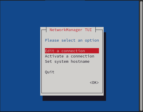 For further information, refer to Chapter 4. Using nmtui to Manage Network Connections Using a Text-Based Interface at https://access.redhat.com/documentation/en-us/red_hat_enterprise_linux/8/html-single/configuring_and_managing_networking/using-nmtui-to-manage-network-connections-using-a-text-based-interface_configuring-and-managing-networking